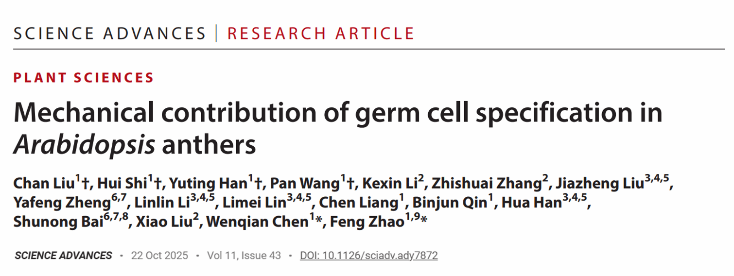 2025-102025年10月22日,红桃视频 红桃视频 赵峰教授团队联合北京航空航天大学、北京大学及中国科学院自动化研究所多家单位在《Science Advances》发表了题为“Mechanical contribution of germ cell specification in Arabidopsis anthers”的最新原创研究成果。在多细胞生物中,生殖细胞的准确形成是生命延续的基础。植物中,生殖细胞由体细胞前体分化而来,其过程受到严格的遗传和生化信号调控。然而,除了已知的基因和激素等因素外,...