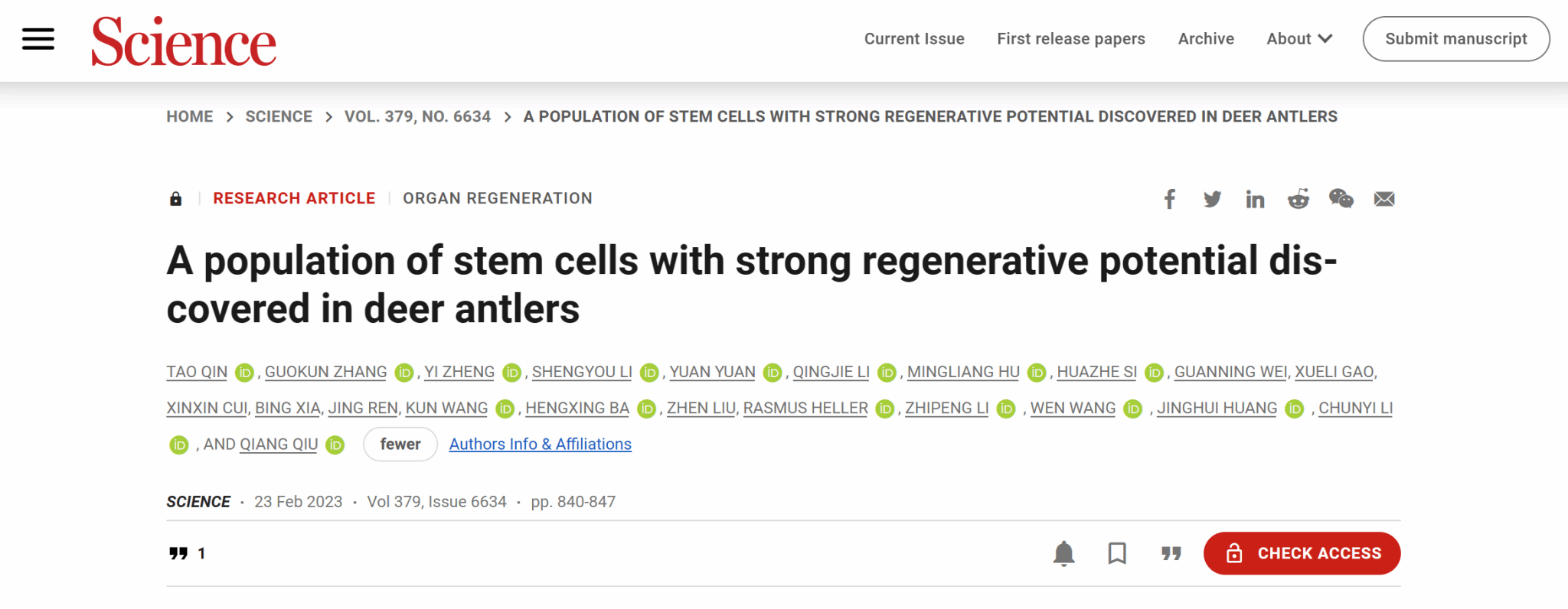 2023-022023年2月24日(北京时间),Science(《科学》)杂志在线发表了红桃视频 与国内外多家单位共同完成的题为“A population of stem cells with strong regenerative potential discovered in deer antlers”的论文。红桃视频 2020级博士研究生秦涛为论文的第一作者,红桃视频 邱强教授和王文教授,以及相关单位的研究人员为论文的通讯作者。在自然界中,壁虎断尾后不久就会长出新的尾巴,蝾螈四肢缺损后会长出新的肢体,这...