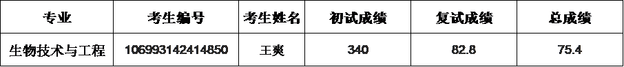因有考生放弃录取,拟对生物技术与工程专业按照总成绩排序依次递补1名,公示如下: