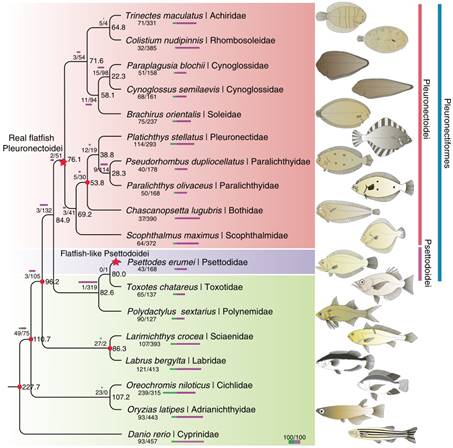 图1:鲽形目鱼类的非单系起源。红色背景表示鲽亚目物种,紫色背景表示鰜亚目物种。