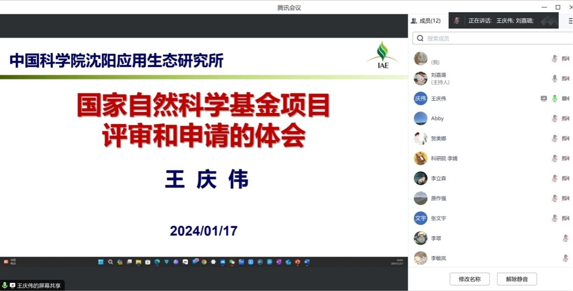 于2024年1月17日上午在学院综合报告厅召开了2024年度国家自然科学基金项目申报动员会。会议邀请中国科学院沈阳应用生态研究所研究员王庆伟线上作报告。学院院长邱强、院长助理原作强及相关申报教师参加此次会议,会议由原作强主持。此次会议通过线上和线下方式同时开展。