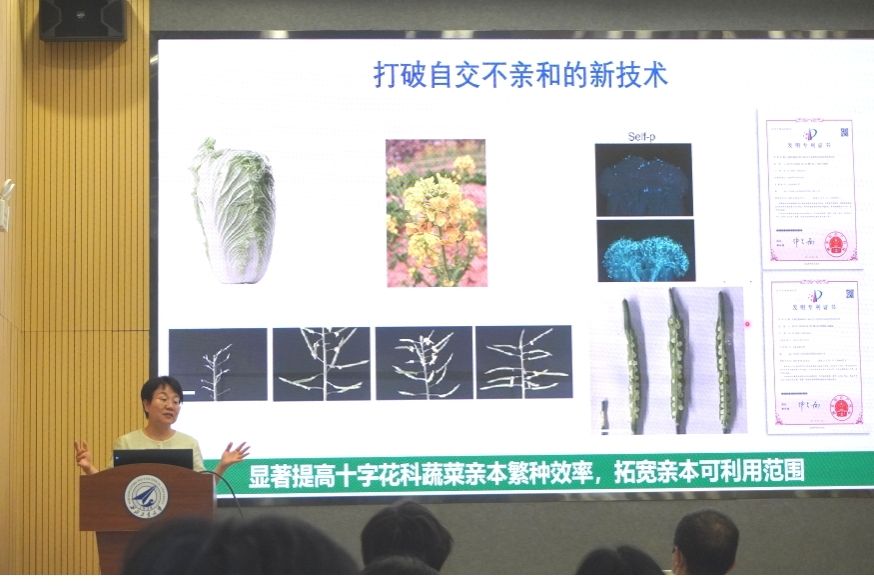 段巧红教授从我国目前蔬菜种子依赖价格高昂的进口现状谈起,提出发展蔬菜育种理论和技术应用研究有助于提高我国种业竞争力。并围绕十字花科植物自交不亲和的调控机制展开讲述,进一步提出自交不亲和是大白菜重要的育种技术,从杂交组合配置、生产F1代杂交种进行详细的讲解。
