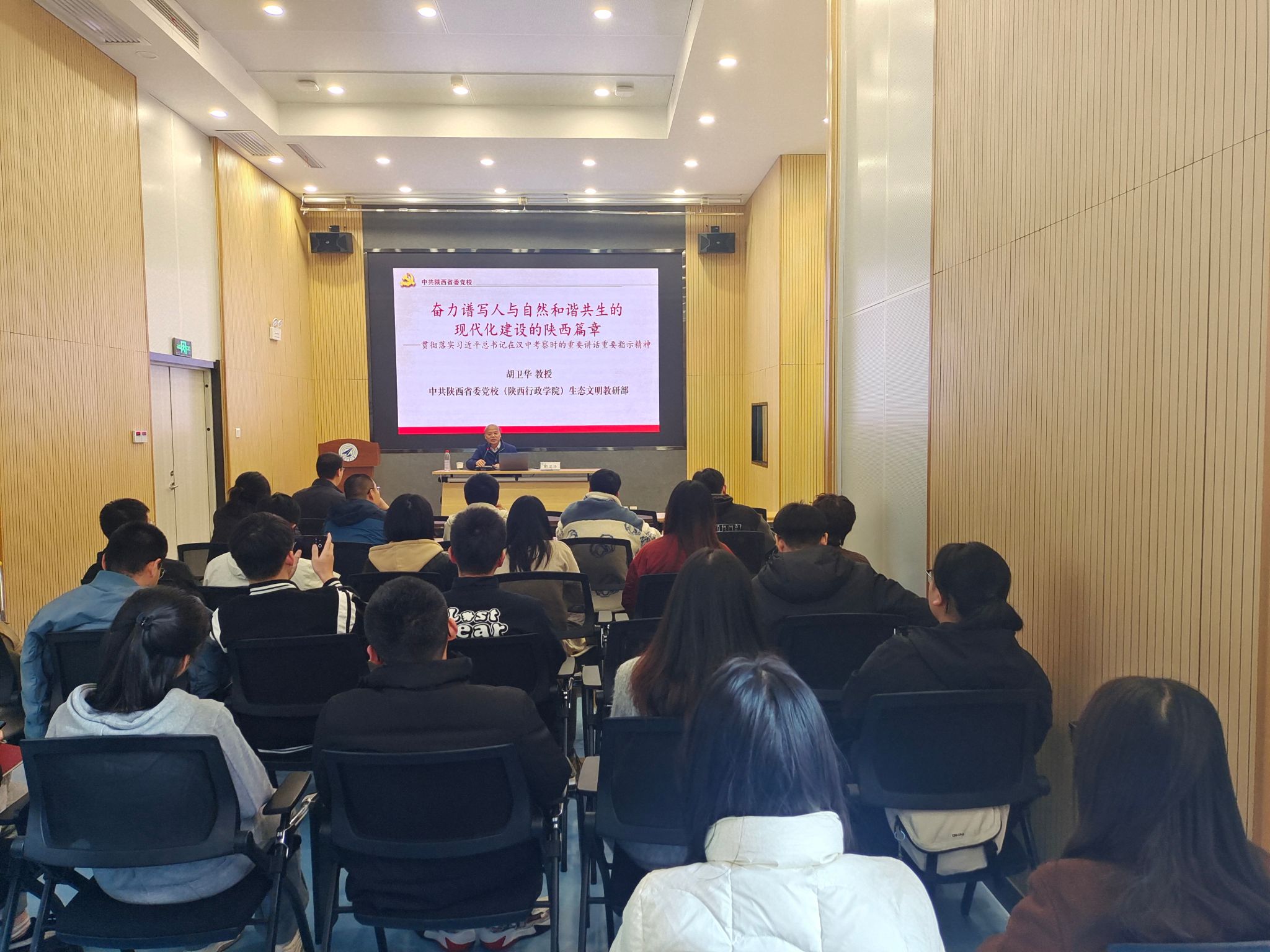 中共陕西省委党校(陕西行政学院)生态文明教研部胡卫华教授以《奋力谱写人与自然和谐共生的现代化建设的陕西篇章--贯彻落实习近平总书记在陕西汉中考察时的重要讲话重要指示精神》为参训学员讲授了第一课。胡卫华从习近平总书记关于人与自然和谐共生的现代化的重要论述、习近平总书记对陕西生态文明建设的要求、结合实际推进陕西省人与自然和谐共生的现代化建设等三大方面层层推进、深入浅出的阐释了习近平生态文明思想的形成过程和鲜明特征,多维度解读了陕西省生态文明建设的总体要求、总体方向和实践路径,引导参训学员进一步牢固树立“绿水青山就是金山银山”的理念,为打好蓝天碧水净土保卫战贡献更大力量。