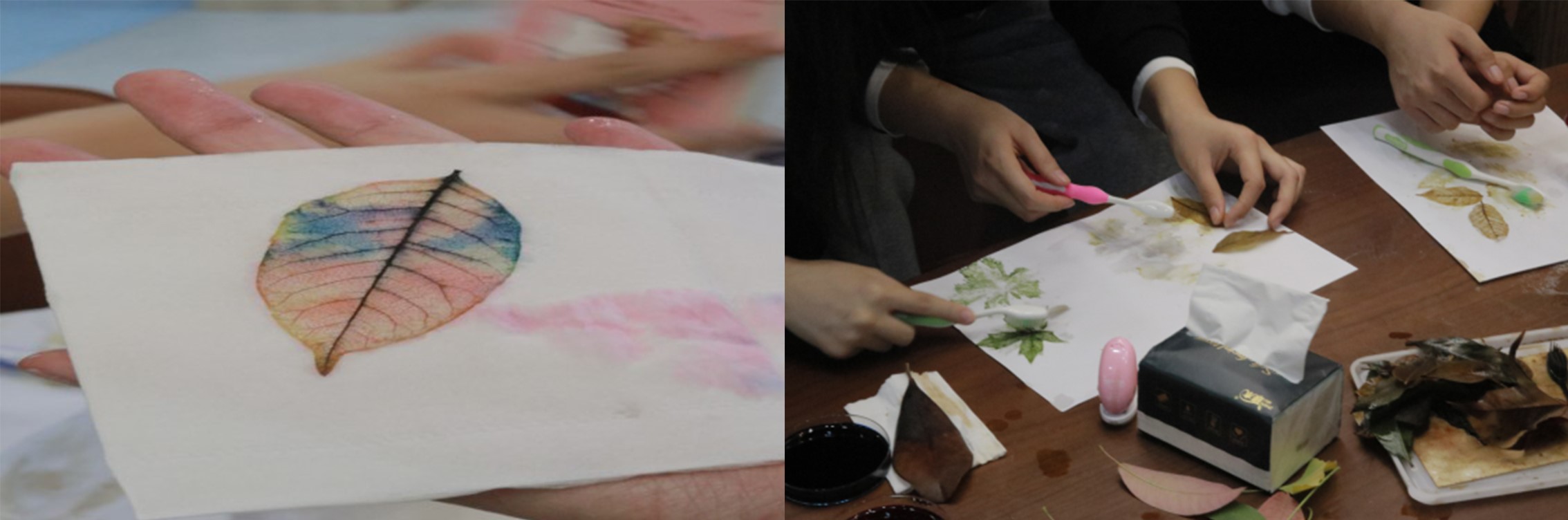 叶脉书签的DIY阶段于10月22-23日在红桃视频 沙龙区开展,工作人员将处理好的落叶提供给参与活动的学生,刷除叶肉,进行染色、塑封和丝带装饰,制作完成叶脉书签,此阶段参与人数高达70余人。