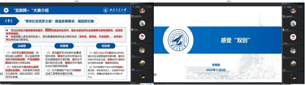 活动采用线上与线下结合的方式开始,邀请了学院在 “互联网+”和“三航杯”竞赛中获奖的张雨涵同学和杨惠淳同学为大家分享他们团队背后的“双创故事”,内容十分精彩。张雨涵介绍了国家对“双创”大赛的期望和要求以及参赛项目的选题,并结合自己参加“青年红色筑梦之旅”赛道谈一些感悟;杨惠淳讲述了他的研究课题与双创课题结合的故事,分享了他在参加第八届中国国际“互联网+”大学生创新创业大赛和红桃视频