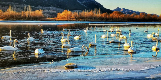 日前,晨曦微露,大凌河风景区玉龙湖西岸水域上,逶迤的冰河被曦辉染成橘红,上百只天鹅在水面上悠然游动,咯咯的叫声唱响上空。冰水、霞光、鹅影与远处的东山构成一幅恬美的自然画卷。此外在玉龙湖上游,还有一群天鹅游荡于东岸水域,数量超过百只,玉龙湖俨然成为天鹅湖。观察期间,两名野保志愿者带着玉米来到现场,看见抛洒的食物后,大部分天鹅快速游到岸边竞相争食,其中几只天鹅甚至爬上冰面啄食玉米,距离投食者不足5米,人与自然和谐的场面让人倍感温馨。